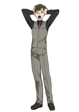 He is an average-looking cell with black messy hair and eyes. He wears a black polo, grey slacks and vest, and a purple tie.